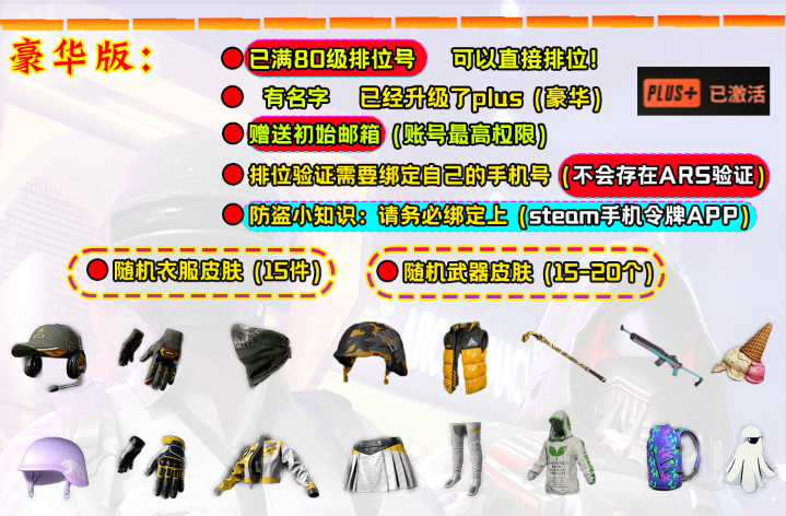 【豪华版-竞技白号-排位号】【四无白号出品】【生存80级】(可排位)(衣服20件+枪皮10-15把随机)(需绑定手机令牌APP)长久质保-找回包赔(赠送初始邮箱!是-账号最高权限)